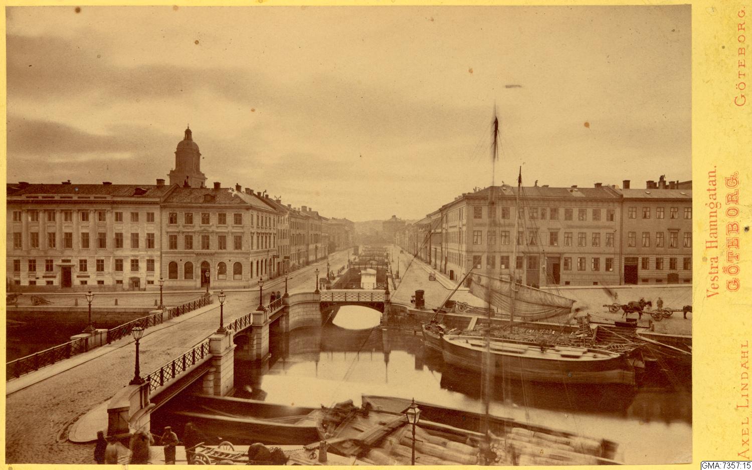 Västra Hamnkanalen och Västra Hamngatan mot söder, sett från Norra Hamngatan. I fonden Allmänna och Sahlgrenska sjukhuset.
