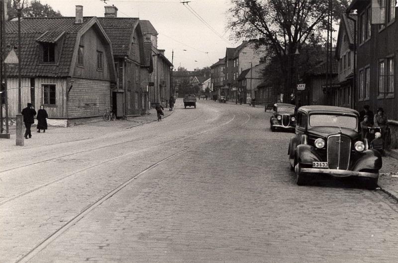 Sträckningsbild av Karl Johansgatan mot öster från nr. 104 (Majornas 1 rote, nr 101). Karl Johansgatan nr 73-71 på vänstra sidan.