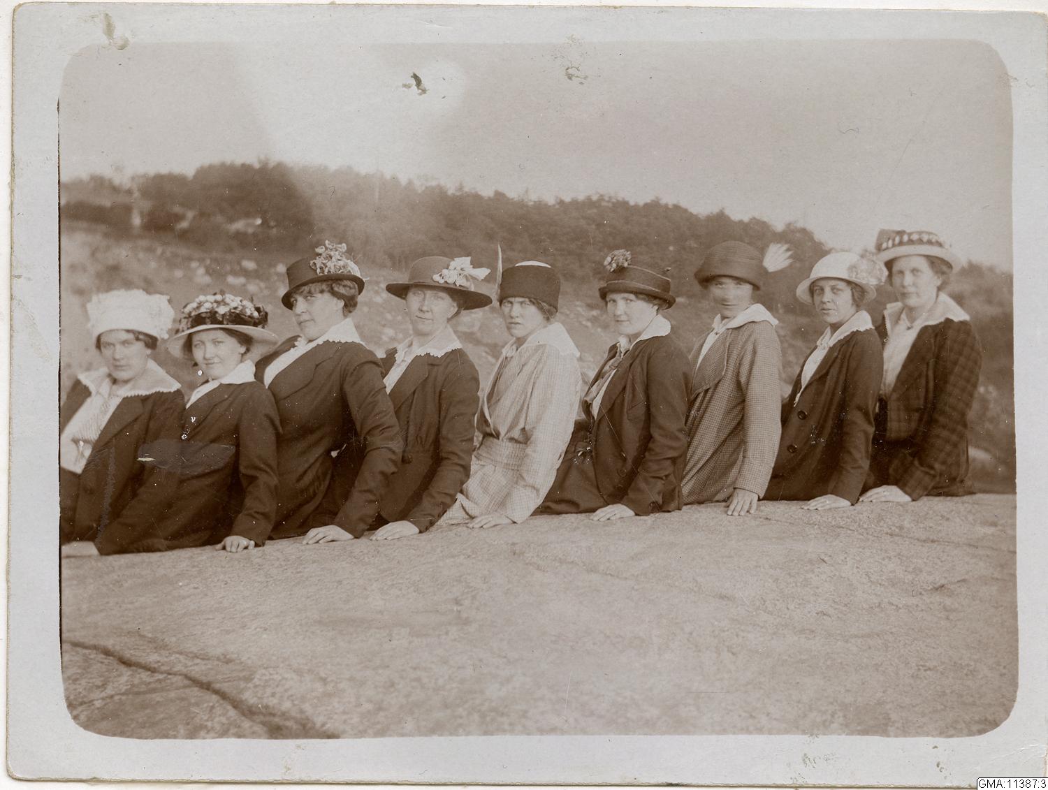 9 st damer paraderar med hattar på en klipphäll, troligen runt 1920.