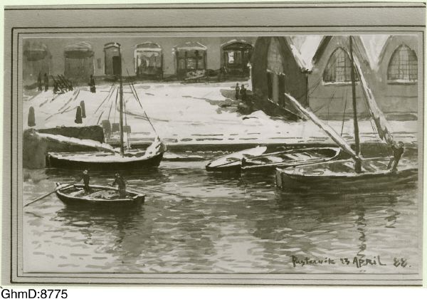 " Pustervik 23 April 88". Akvarell av parti av kanalen nedanför Fisktorget m. Fiskkyrkan t.h. - Snö. Båtar, bl. a. eka m. två roddare. Inre mått: 22,3 x 13,7 cm.