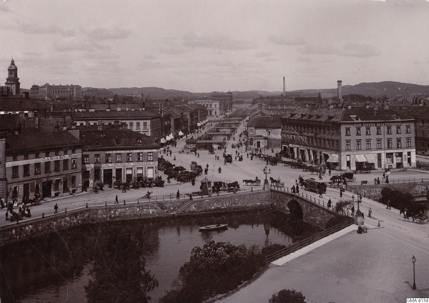 Utsikt norrut från Stora Teatern mot Kungsportsplatsen och Östra Hamngatan. Till höger om Östra Hamnkanalen skymtar Vattenreservoaren. I fonden hamnen och Hisingen