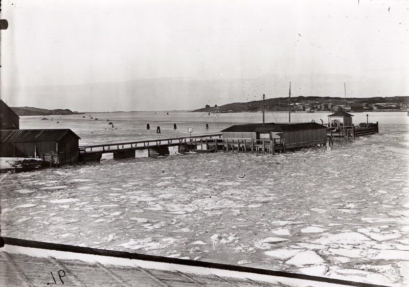 Klippan, t,v del av Ostindiska kompaniets gamla magasin, t.h. Klippans Tullstation. Vy mot Hisingen - Färjenäs.