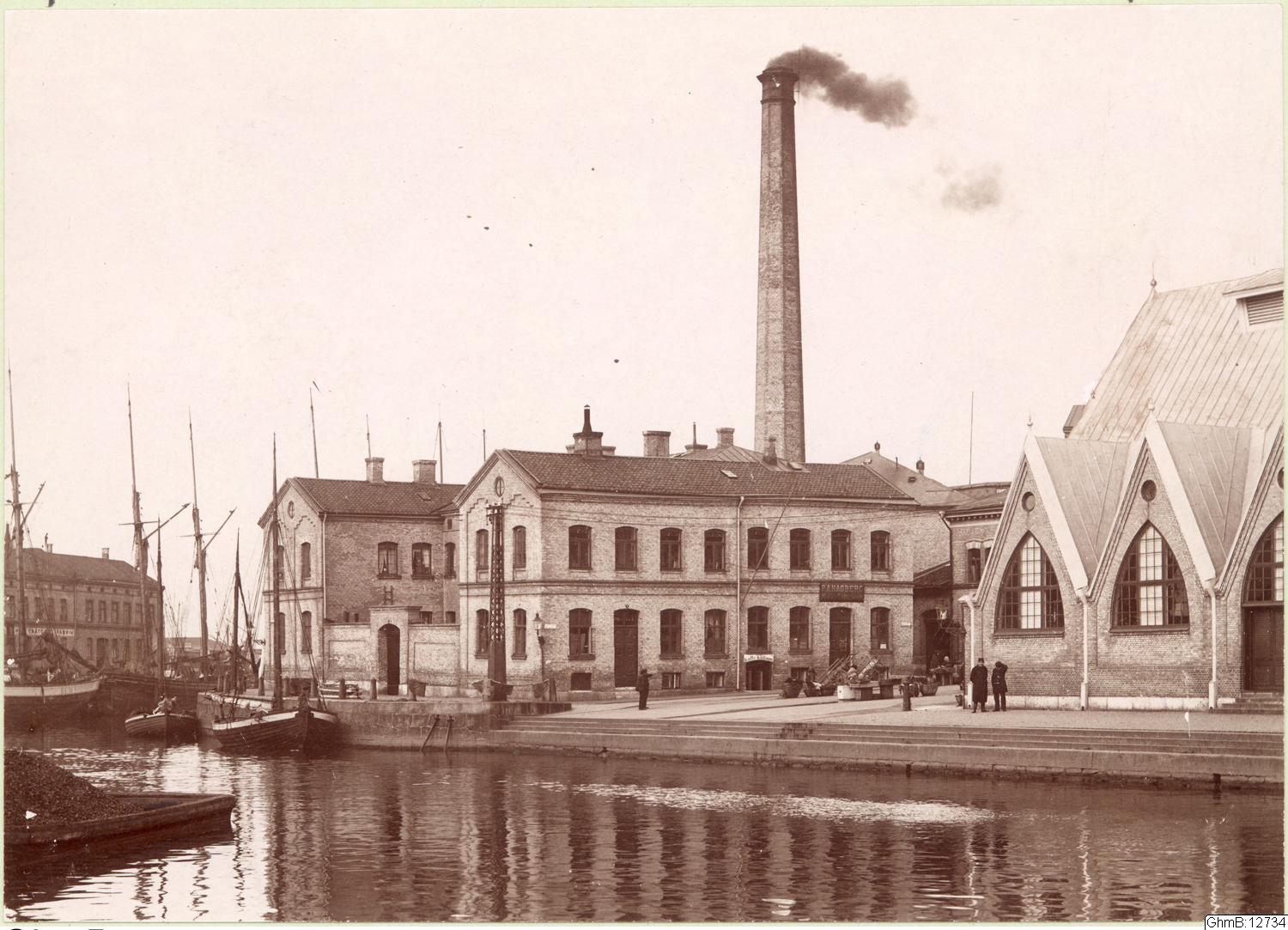 Sträckningsbild längs Rosennlundskanalen med Feskekörka till höger och det tidigare Ångköket till vänster. Vid 1901 fanns butiker i byggnade bland annat Systembolagets föregångare.