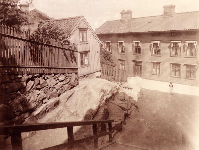 Majornas 5 rote, nr. 145, Klamparegatan 23, sett från Hobergs Trappor. T.v. Majornas 5 rote, nr 141, Klamparegatan 26, vid hörnet Hobergs Trappor.