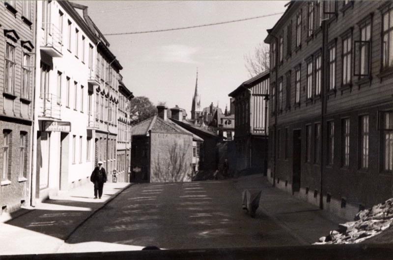Klamparegatan 34 t.h. och 33 och 31 t.v. vy mot öster från trappan upp till Kyrkoliden.