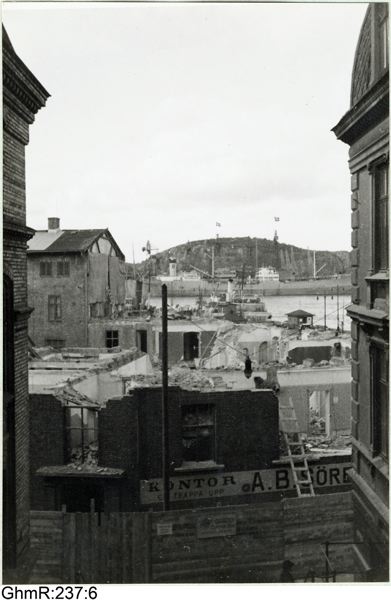 Från rivningen av fastigheten Skeppsbron 1, vari bl. a. förut Sjöfartsmuseet varit inrymt. Utsikt från Södra Liden. I fonden Ramberget.