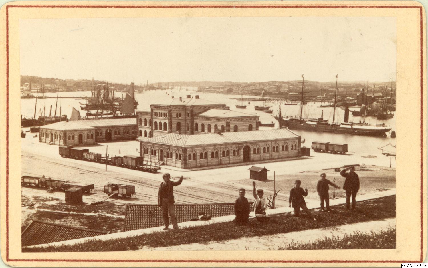 6 stycken pojkar på Kvarnberget. Nedanför dem Packhusplatsen med Tullpackhuset och hamnen. Ute på älven ligger flera fartyg. I fonden Göta älv och Hisingen.