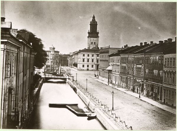 Norra Hamngatan och Stora Hamnkanalen sedda mot väster från Hotell Göta Källare. Exemplar i Stadsbiblioteket bär årtalet 1871.