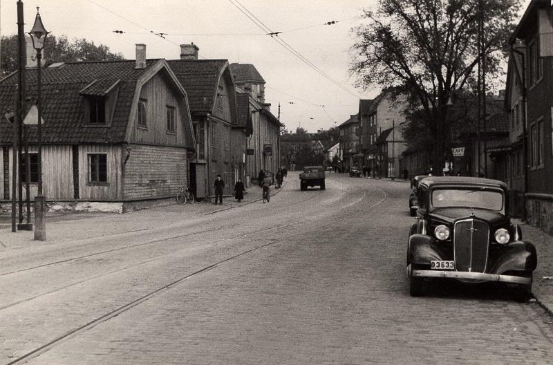Sträckningsbild av Karl Johansgatan mot öster från nr. 104 (Majornas 1 rote, nr 101). Karl Johansgatan nr 73-71 på vänstra sidan.