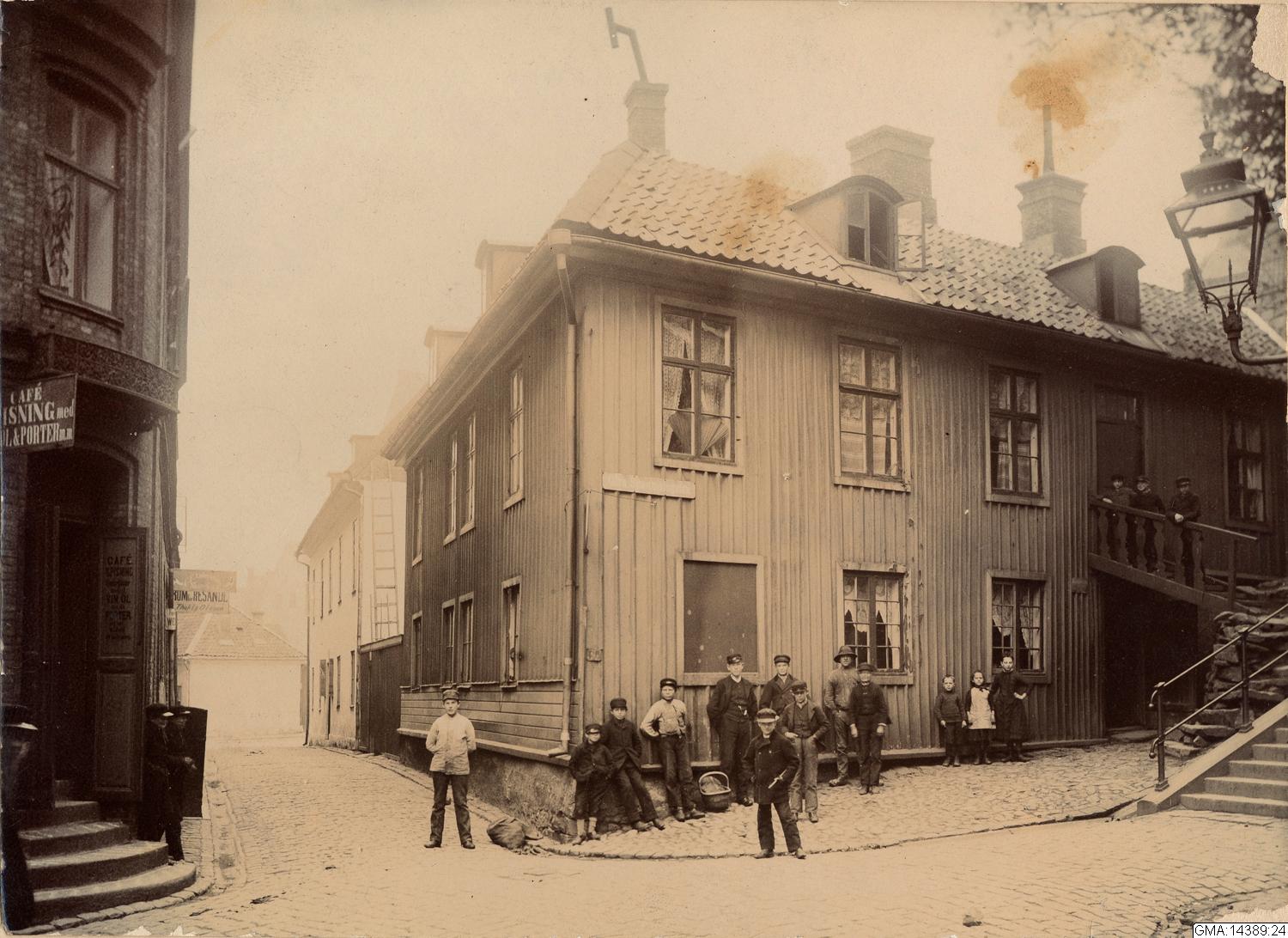 Nedre Qvarnbergsgatan åt söder, från hörnet af Spannmålsgatan. Till höger början af trapporna uppåt Qvarnberget, i midten hörnhuset af trä no 40 med den egendomliga trätrapp till andra våningen, i nedre våningen, rummet längst åt söder, lärer skalden Wadman bott. 1888.