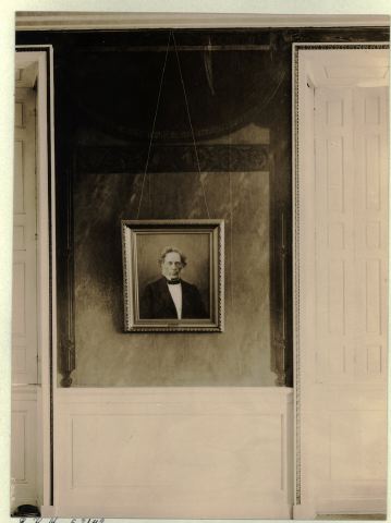 detalj av rumsinredning på väggmålningar på väv från 1800-talets förra del. i Rådhuset, Gbg.