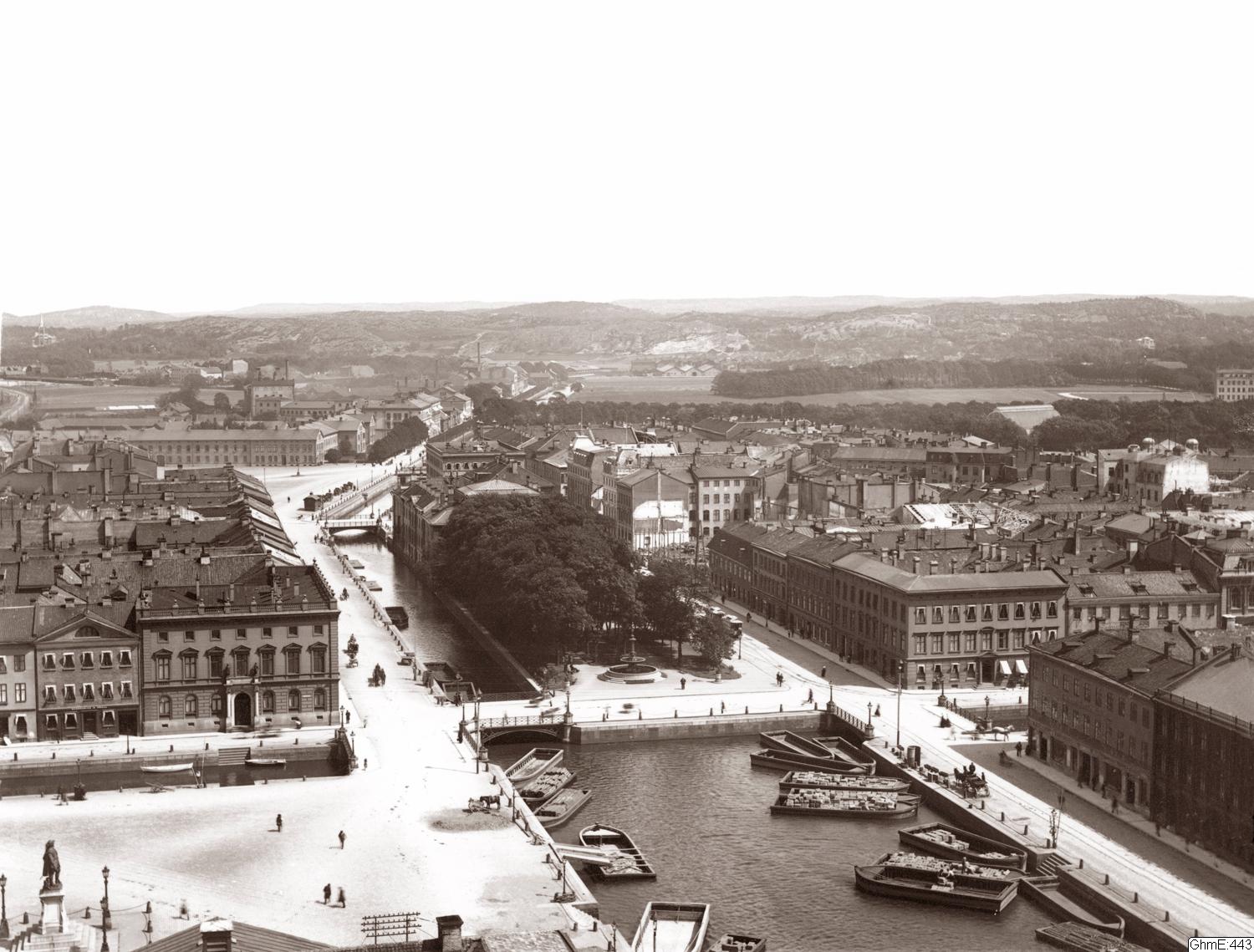 Utsikt mot öster från Kristine kyrkas torn. I bildens mitt Stora Hamnkanalen och Brunnsparken.I nedre vänstra hörnet Gustav II Adolf som staty. Vid Drottningtorget syns fasaden på fattigvårds- och arbetsinrättningen "Bracka".