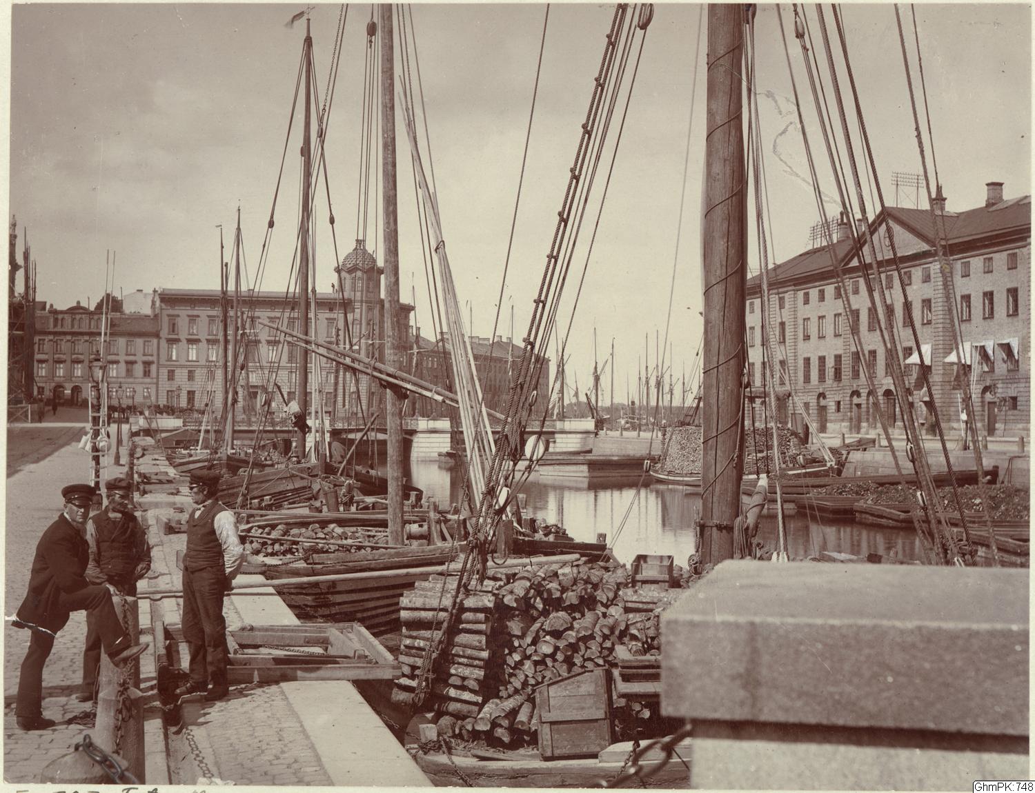 Utsikt över Stora Hamnkanalen och Lilla Torget, cirka 1890. Blick från Tyska bron.