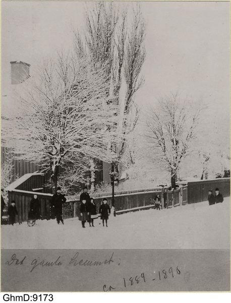 A tergo å originalet: Det gamla hemmet vid Vasaplatsen, Gbg. Exproprierades år 1895. Personerna i fonden äro från vänster: förgyllare B. Olsson samt Herr Axel W. Pettersson (anm.: son till kopparslagare C.H. Pettersson), barnen framför dem från vänster Signe W. Pettersson, Gerda Olsson, Erik Gustafsson.