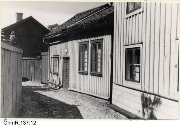 Nilssonsgatan. Östra sidan sedd från Gröna Gatan. Fr. h. Majornas 1 rote, nr 237 (del av, Gröna Gatan 11A), 123 och 125.