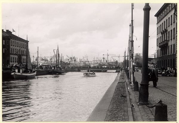 Stora Hamnkanalen mot Residensbron. T.v. Residenset. I vattnet: turistbåten "Paddan".