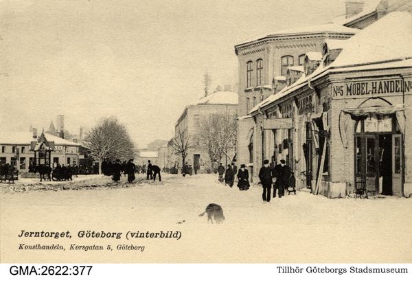 Järntorget sett från Landsvägsgatans mynning. Arbetareföreningens hus med möbelbutik t.h. I bakgrunden Järntorgsgatan.