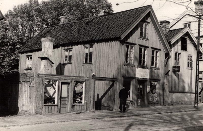 Fr.h. Karl Johansgatan 69 (västlig, fristående flygel), 71, 73 (under rivning). Speceriaffär i mitten. Bilden sedd från s.v.