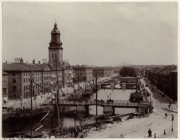 Utsikt över Stora Hamnkanalen samt Norra och Södra Hamngatorna från Lilla Torget under omkring 1890.
