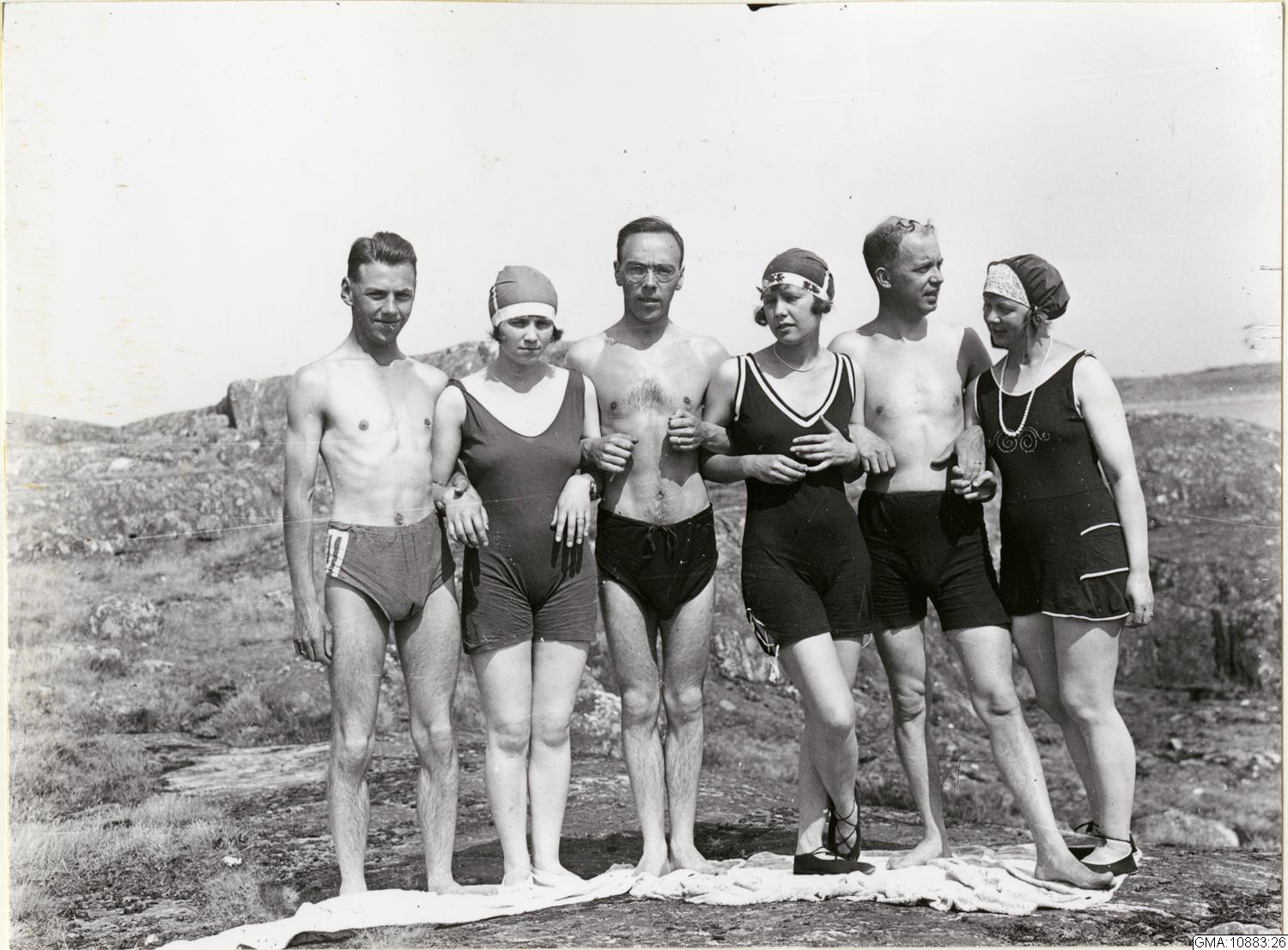 Bilden visar ett sällskap iklädda badkläder, i troligtvis Helsingsborgstrakten. Jämför med GMA:10883:27 förefaller vara samma sällskap och möjligen samma tillfälle.
