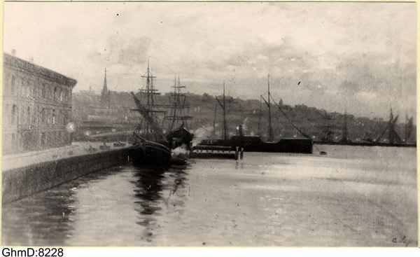Oljemålning på duk.Längst till vänster fastigheten Skeppsbron 4.Tornsilhuetten strax höger om är Oscar fredrikskyrkans. Proveniensbestämningen har gjorts genom direkta observationer på plats.