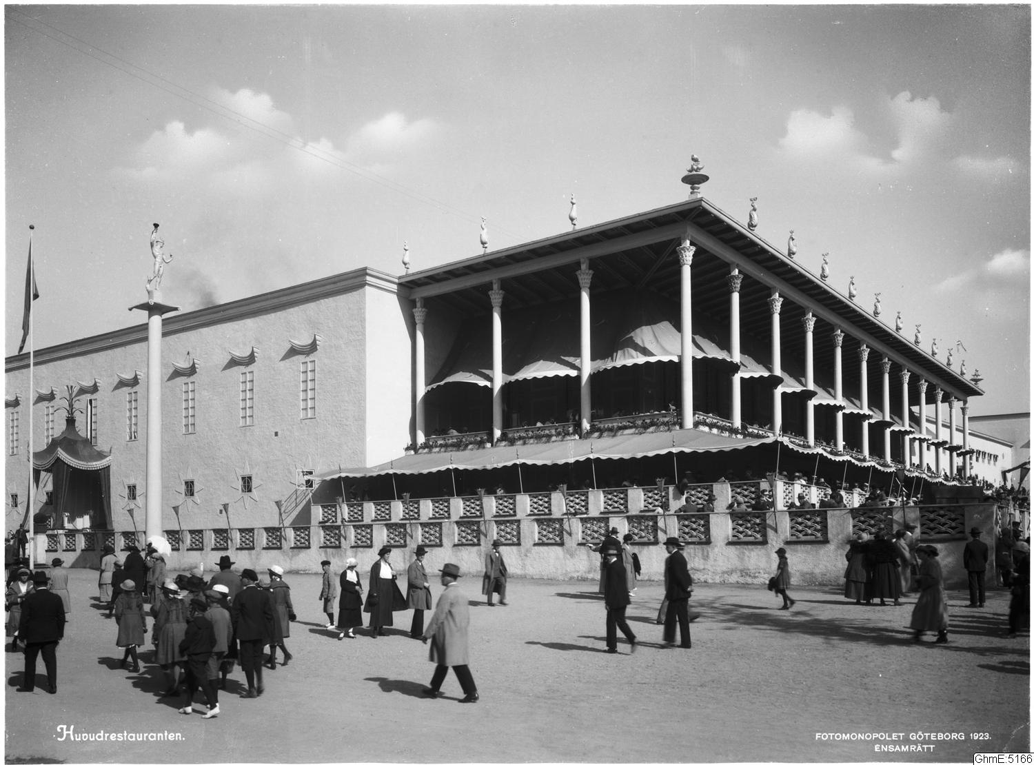 Huvudrestauranten på Jubileumsutställningen, sedd från Stora Gården mot sydöst. Till vänster vägen mot Exportgården och Liseberg.