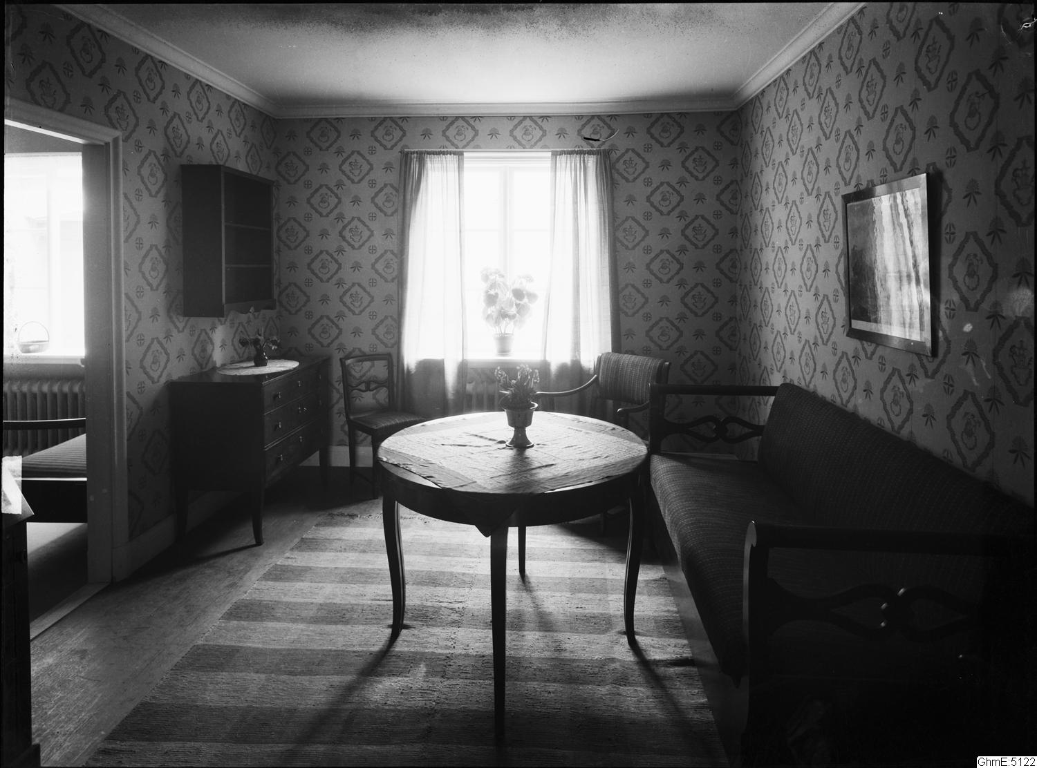 Bostadsinteriör, vardagsrum i lägenhet om 2 rum och kök. Möblerna formgivna av Carl Malmsten. Rum 127, Föreningen Hus och Hem, Utställning av smålägenheter, Jubileumsutställningen 1923.