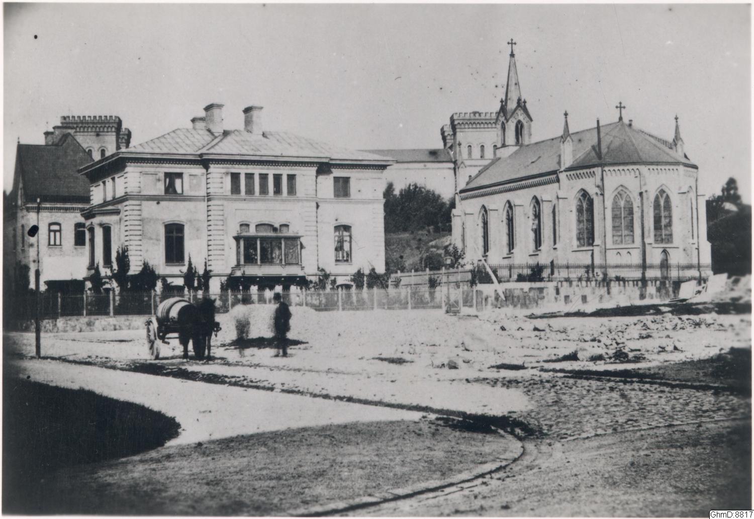 Gegerfeltska villan och Engelska kyrkan med Arsenalen/Tyghuset på Kungshöjd i bakgrunden. Arsenalen tillhörde Kungliga Göta Artilleriregemente.