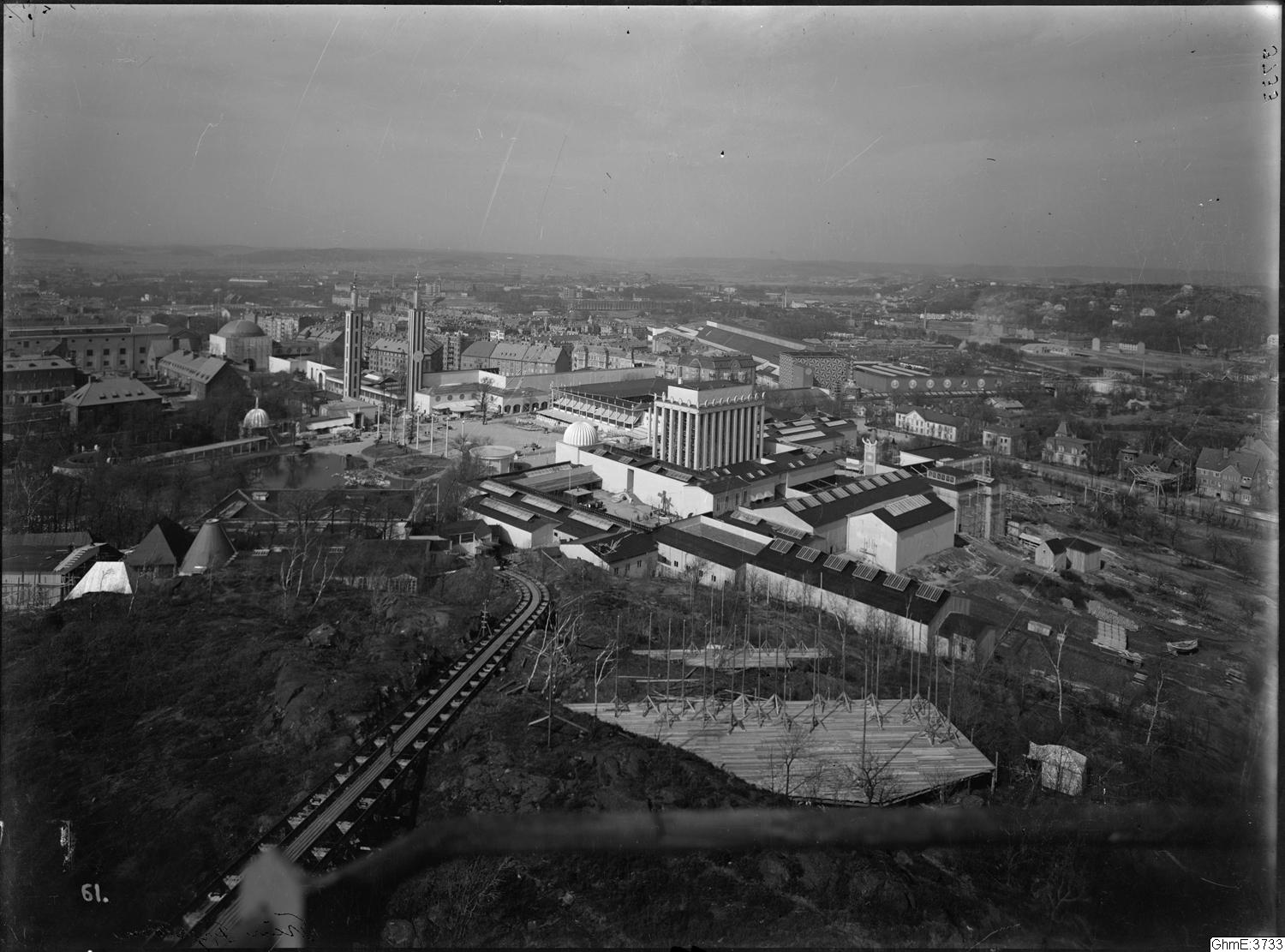 Översiktsbild över delar av Jubileumsutställningen 1923, med Minneshallen mitt i bild, minareterna och entrékupolen till vänster. I bildens framkant syns rälsen för Bergbanan i Johanneberg, bilden tagen från Fyrtornet, som var slutstation för Bergbanan.