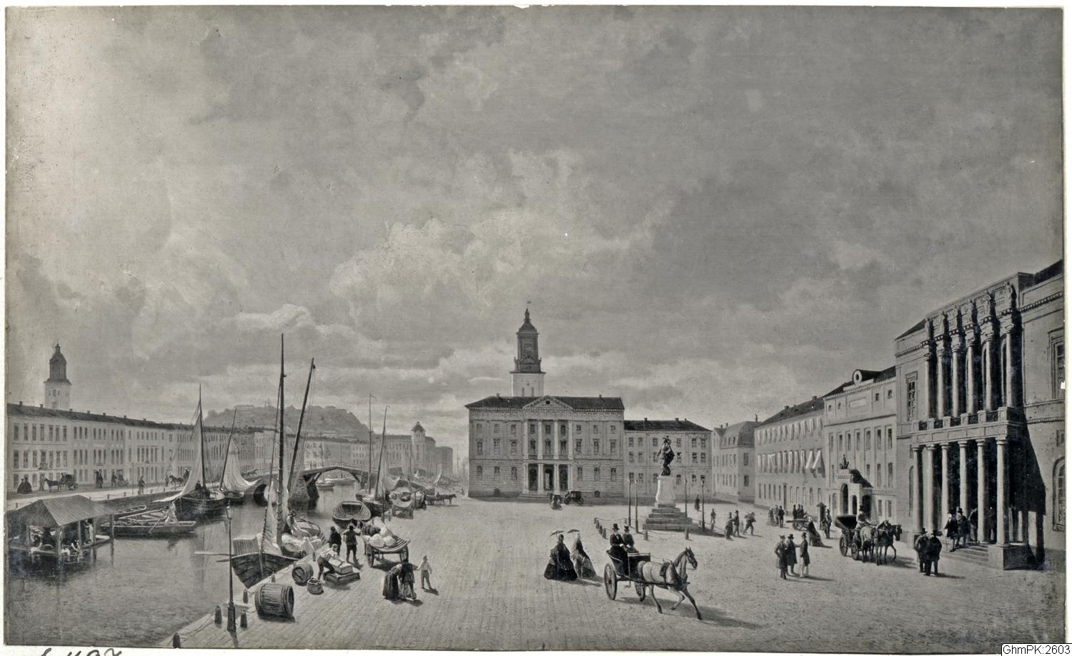 Oljemålning föreställande Gustav Adolfs torg, Stora Hamnkanalen och Södra- och Norra Hamngatan. I fonden Lilla Torget och Otterhällan.