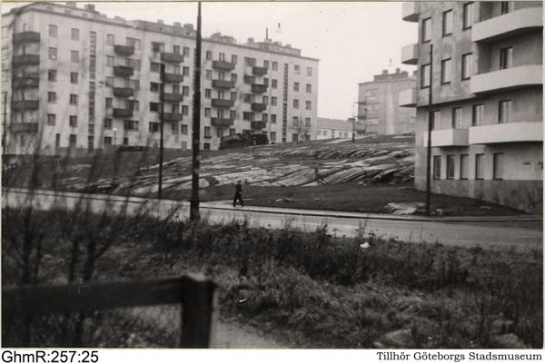 Gibraltargatan 64-68 (t.v.) sett från Eklandagatan fr. S.O. Längst t.h. liten del av fastigheten Mackliersgatan 2-4.