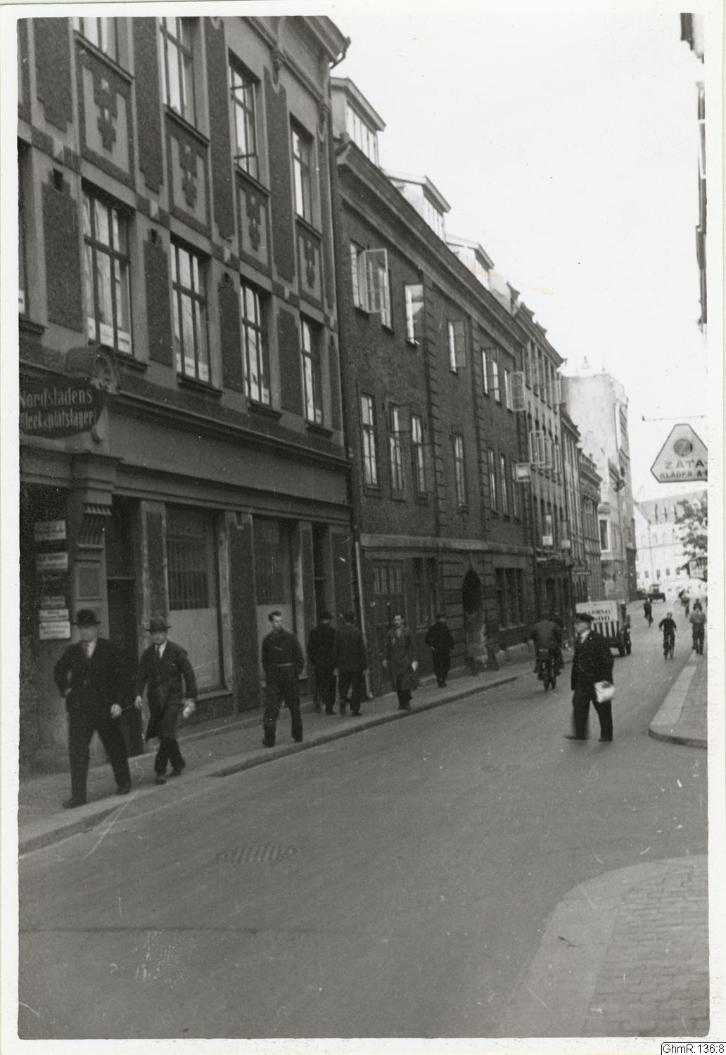 Sträckningsbild med Smedjegatan nummer 5 och 3 (dvs Norra Hamngatan 6 respektive Postgatan 3B) tagen i korsningen med Köpmansgatan. I fonden anas Kvartersgatan 1 med Förenade Kaffeimportörers rosteri Triangelns kontor och rosteri.