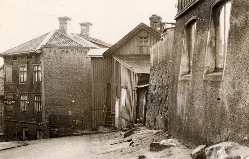 Klamparegatan, fr.v 28, nr 30 och 32 t.h. Majornas 5 rote, nr. 143. Vy från väster.