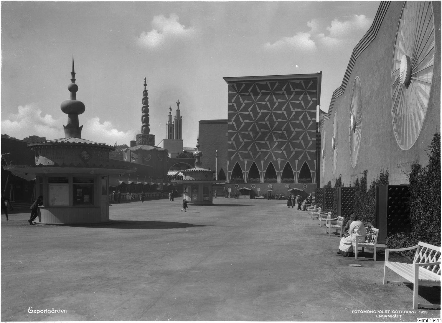 Exportgården/Stengården med minrareterna i väster. Till höger Exporthallen. Järngården med Pommactornet vid Kafé Röda valven