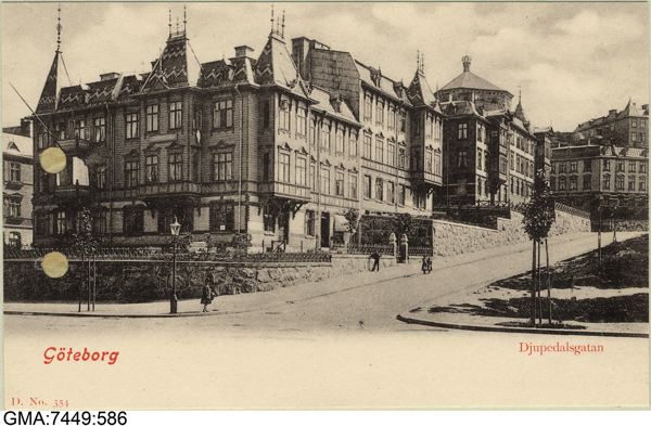 Djupedalsgatan invid Linnégatan. Högra sidan ännu obebyggd. I bakgrunden Skansen Kronans tak.