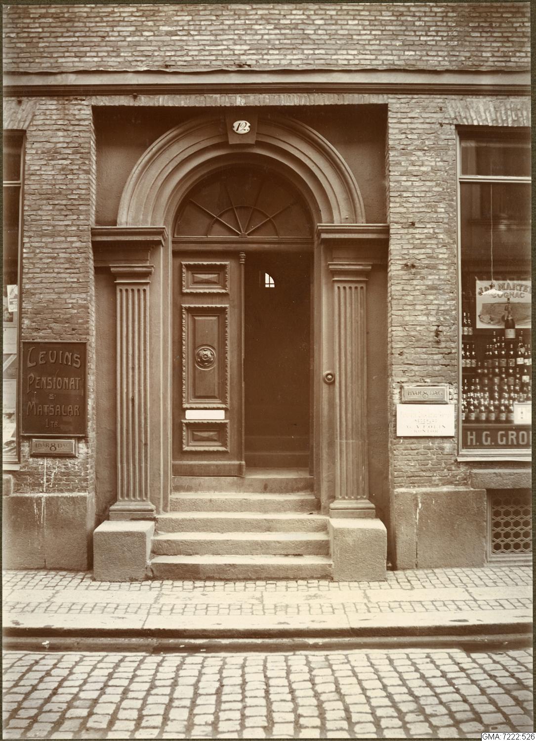 Porten leder till Levins pensionat och matsalar samt tidningen Hvar 8 dags redation. Till höger skyltfönster för Grom's vinhandel.