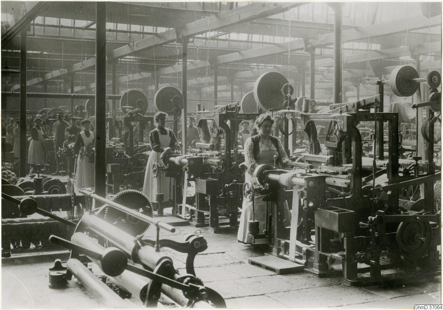 De kvinnliga arbetarna bär stora förkläden, männen bär arbetsskjortor och "vegamössor"