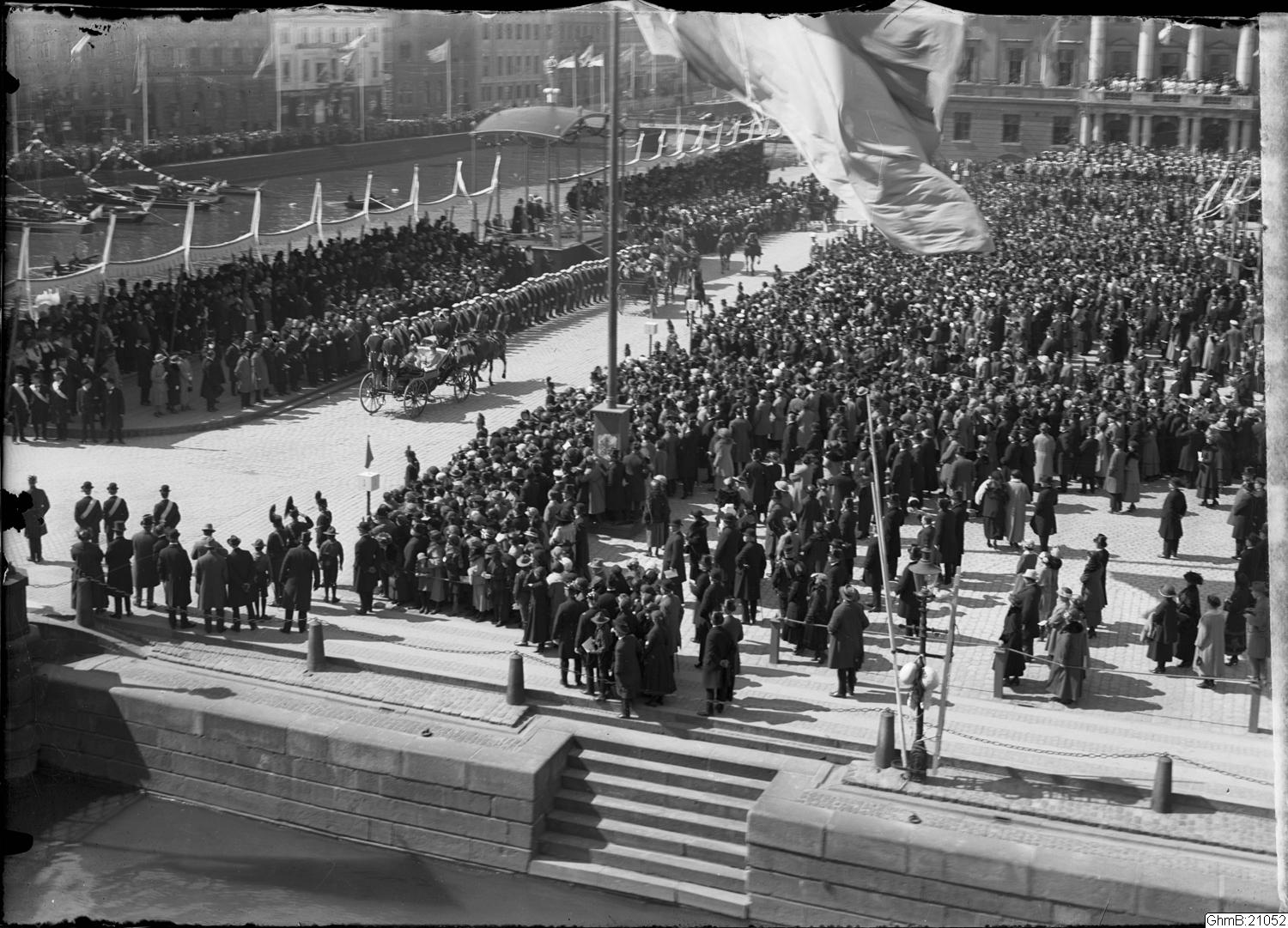Öppningshögtidligheterna för Jubileumsutställningen 1923, den 8 maj på Gustaf Adolfs torg. Klockan 11 ca, på förmiddagen anlände de kungliga till torget från Residenset. Ett podium var uppbyggt vid kajkanten till Stora Hamnkanalen, varifrån flera tal hölls.