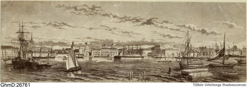 Del av Göteborgs hamn sedd från Hisingssidan. Efter ett träsnitt i Ny Illustrerad Tidning efter teckning av Robert Haglund.