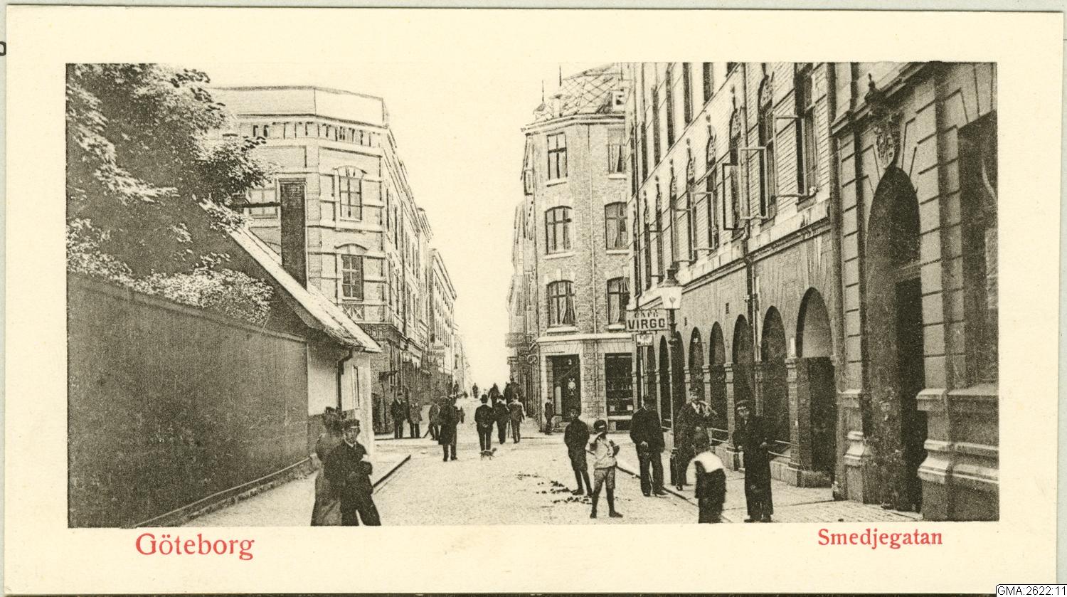 Sträckningsbild med Smedjegatan mot söder. Till vänster i bild, bakom planket, Kronhuset med tyggården för fortifikationen. Till höger Smedjegatan 1. Längre fram korsar Postgatan med nr 5 till vänster och nr 3 till höger om Smedjegatan.
