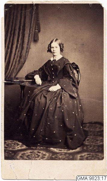 Studiofotografi föreställande Fanny Grén. Svartvit bild. Bilden är vikt på ett par ställen i underkanten och mitt på. De båda övre hörnen skadade på överkanten. Fotot har också hål efter nål/häftstift i överkant.