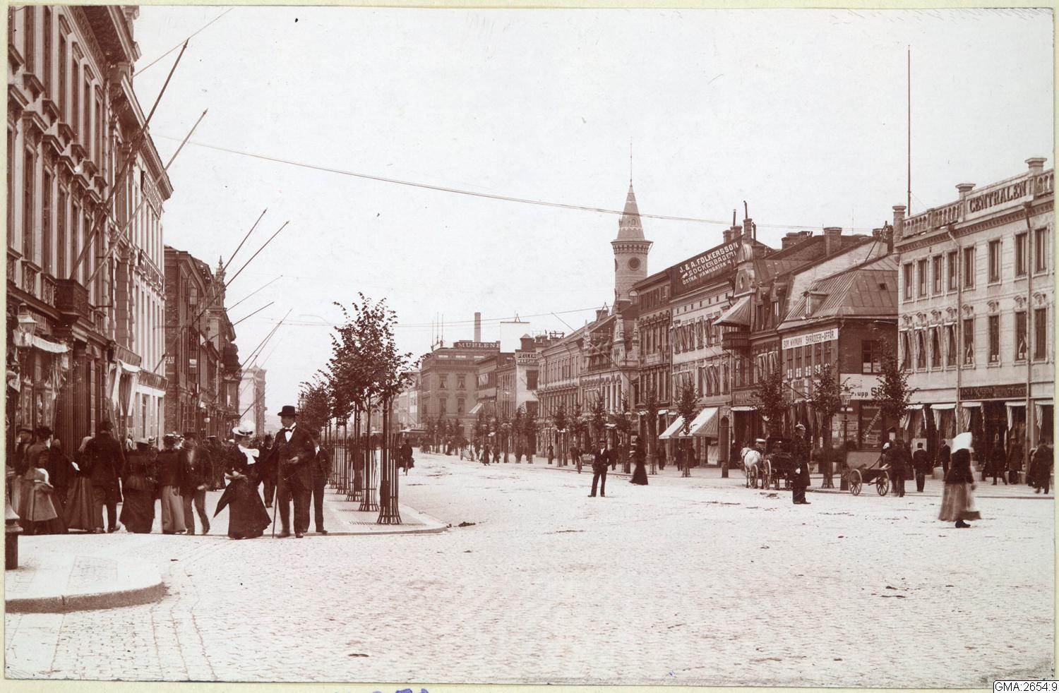 Östra Hamngatan mot norr, gatan kantad med butiker och till höger det nya affärskomplexet Centralen. Några av butikerna var Göteborgs utskänkningsbolag, Mühlenbockska fruktaffären, Boye & Thoresen och Jönköpingsmagasinet. Centralen låg vid Kungportsplatsen och Östra Hamngatan.
