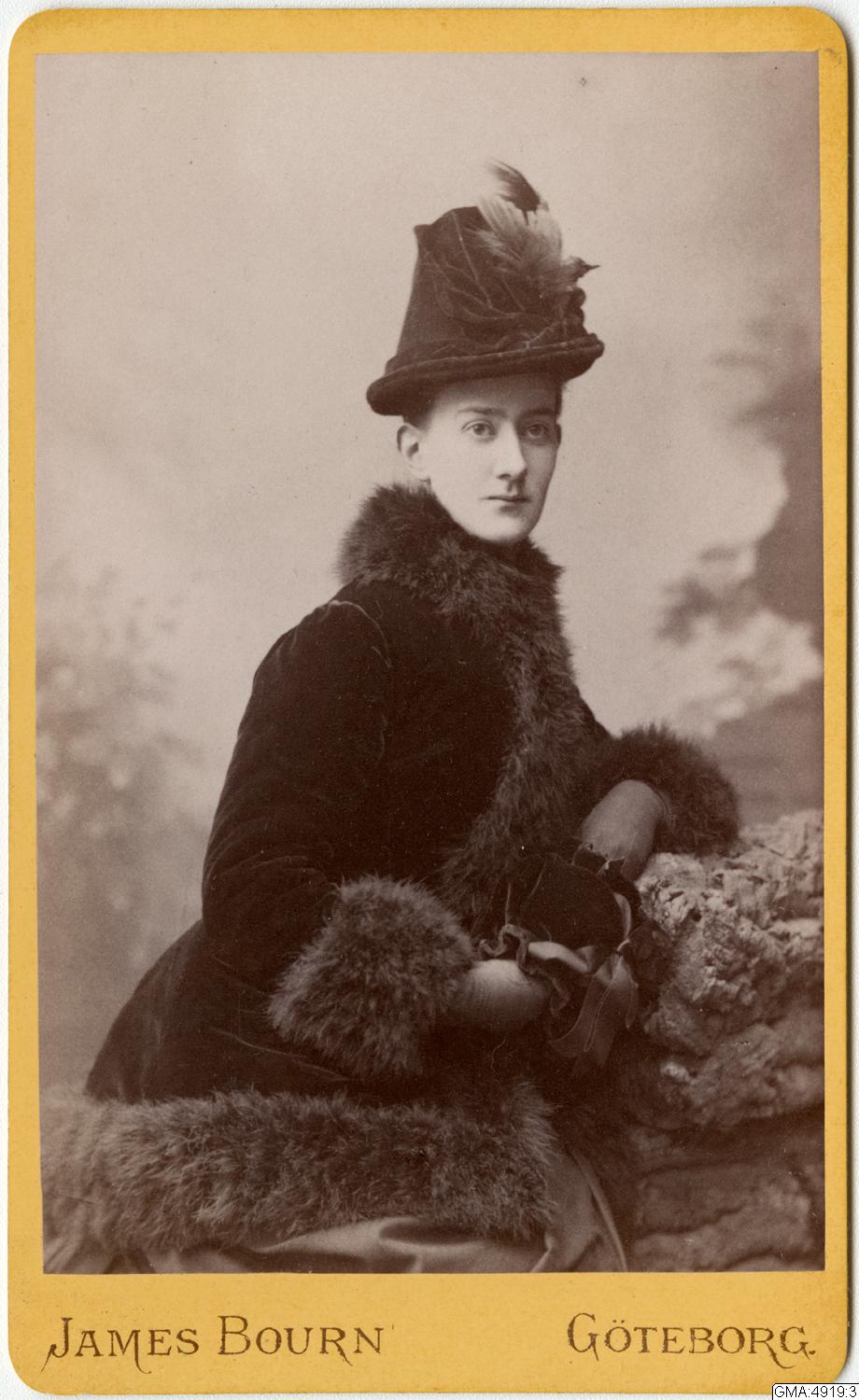 Ellen Dickson bär pälskantad sammetsjacka, muff och en hatt med en uppstoppad fågel.