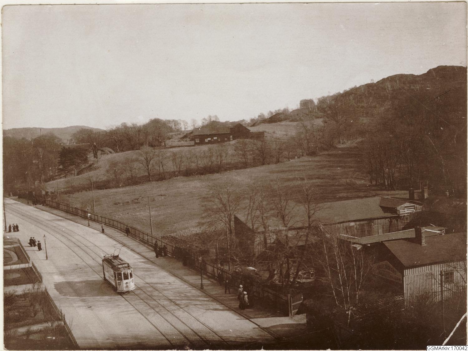 Fotot ... "Det är taget från fönstret... Södra Vägen 22. Huset ligger mitt emellan Tegnérs- Ovh Berzeliigatorna. Skulle tro att bilden är tagen senast 1910. Spårvagnen är en Mölndalsvagn, som ju var lite för mer än andra spårvagnar och -liksom Långedragsvagnen - hade inbygd plattform.