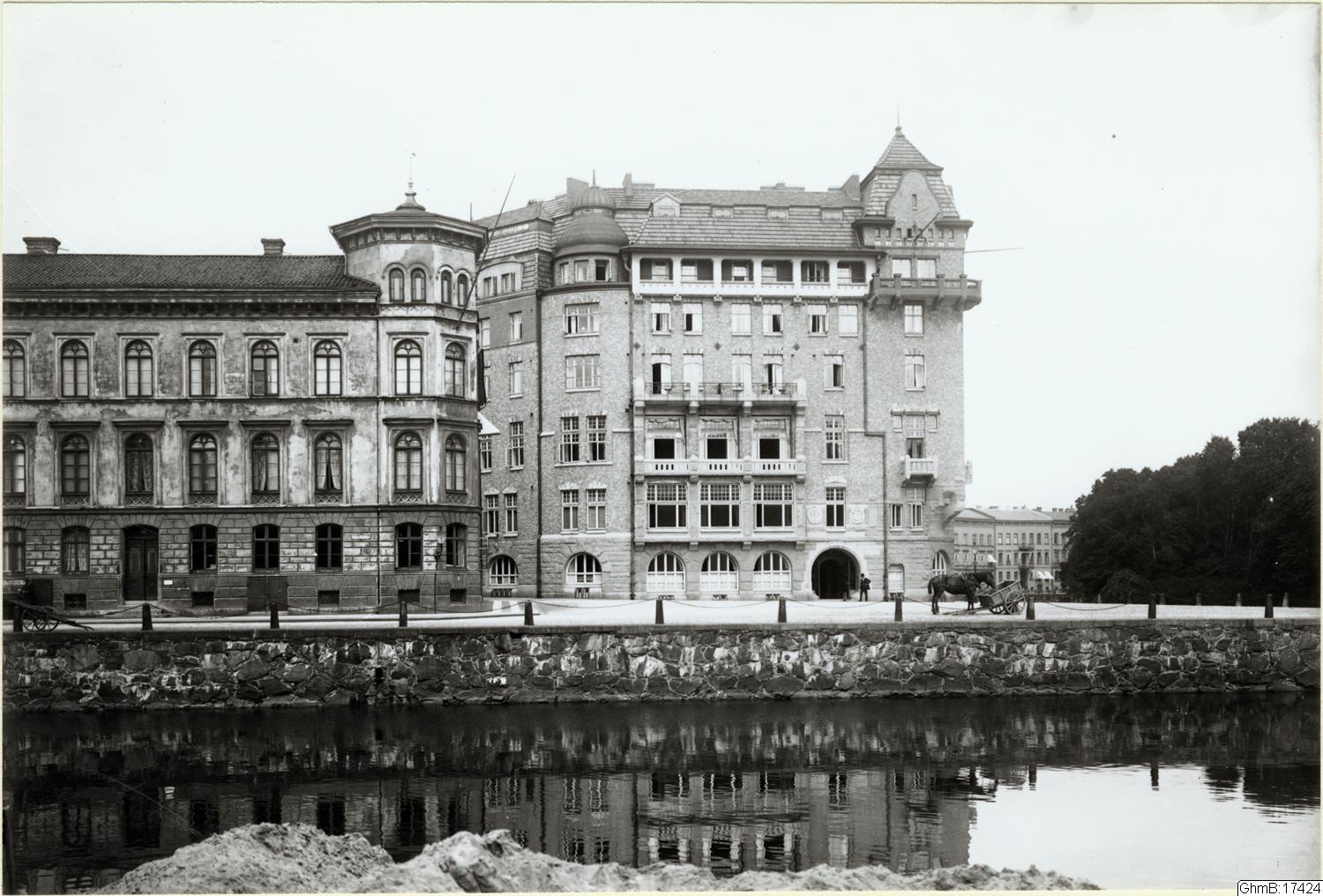 Blick över vallgraven mot Bastionsplatsen och Stora Nygatan. Till vänster Stora Nygatan nr 27-29, Ekmanska huset och till höger Kontoristföreningens hus, Stora Nygatan 23-25.