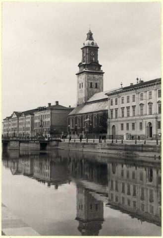 Parti av Norra Hamngatan västerut. Från höger Rådhuset, Christinae kyrka, nr 14 och 12.