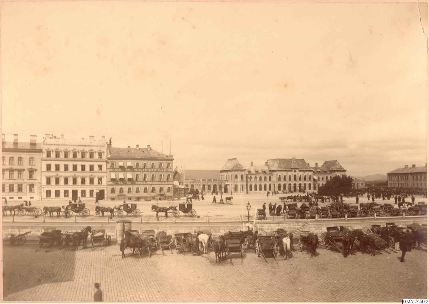 Vy över Drottningtorget, fotot taget från Slussplatsen, på båda sidor av Fattighusån. På Drottningtorget syns Hotel Christiania, Statens järnvägsstation och längst till höger syns en del av Göteborgs arbets- och fattigförsörjninganstalt, Bracka. På norra kajkanten finns till vänster en droskstation för häst, på den södra uppställda kärror och häst.