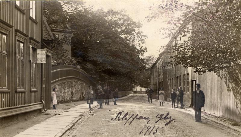 Klippgatan mot Carnegieska bruken från nr. 20 (Majornas 1 rote nr. 43), t.v. i bild. T.h. Klippgatan nr 3 Majornas 2 rote nr 7, därefter2:a roten nr. 6.