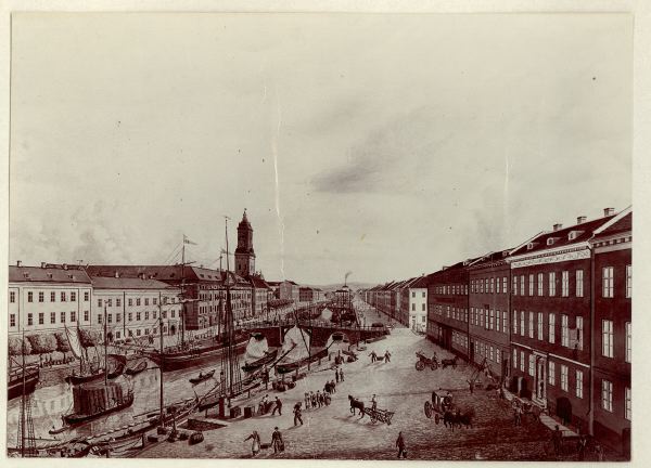 Utsikt över Stora Hamnkanalen från Lilla torget efter 1817 då den gamla Tullkammaren i hörnet av Norra Hamngatan och Smedjegatan påbyggdes med en tredje våning