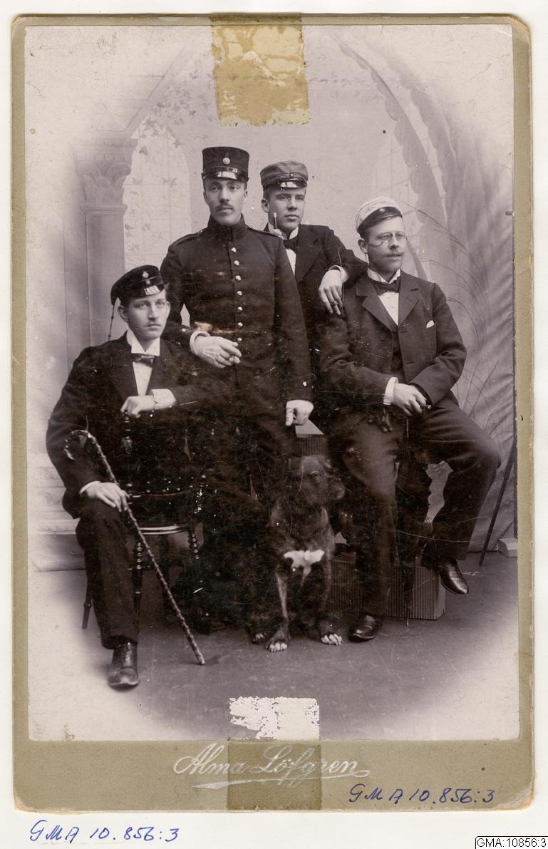 Till högerchalmerist Friberg i mitten okänd officer och okänd gymnasist till vänster Student Friberg.